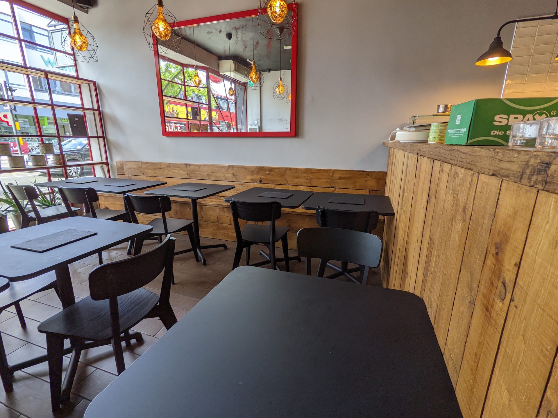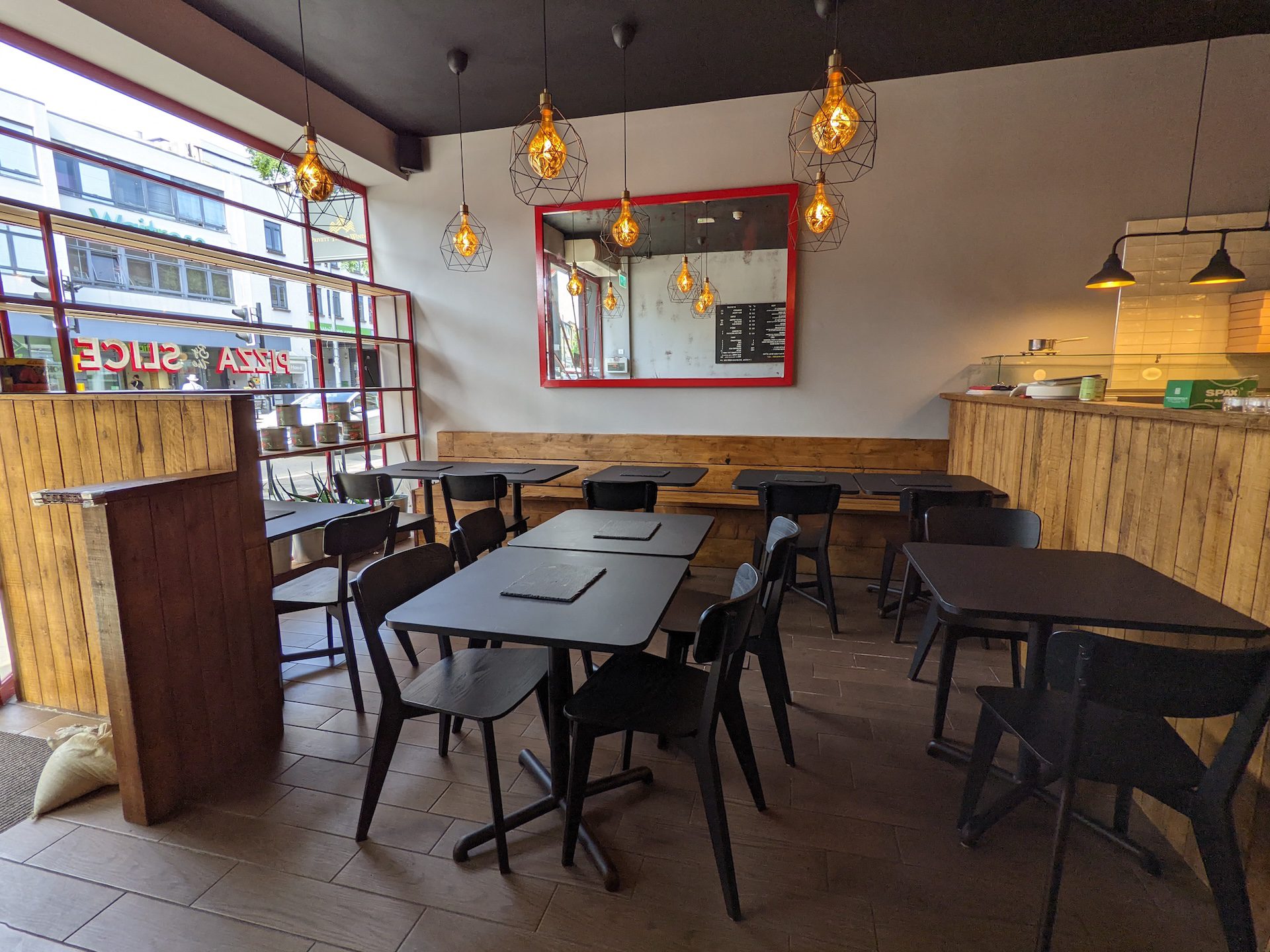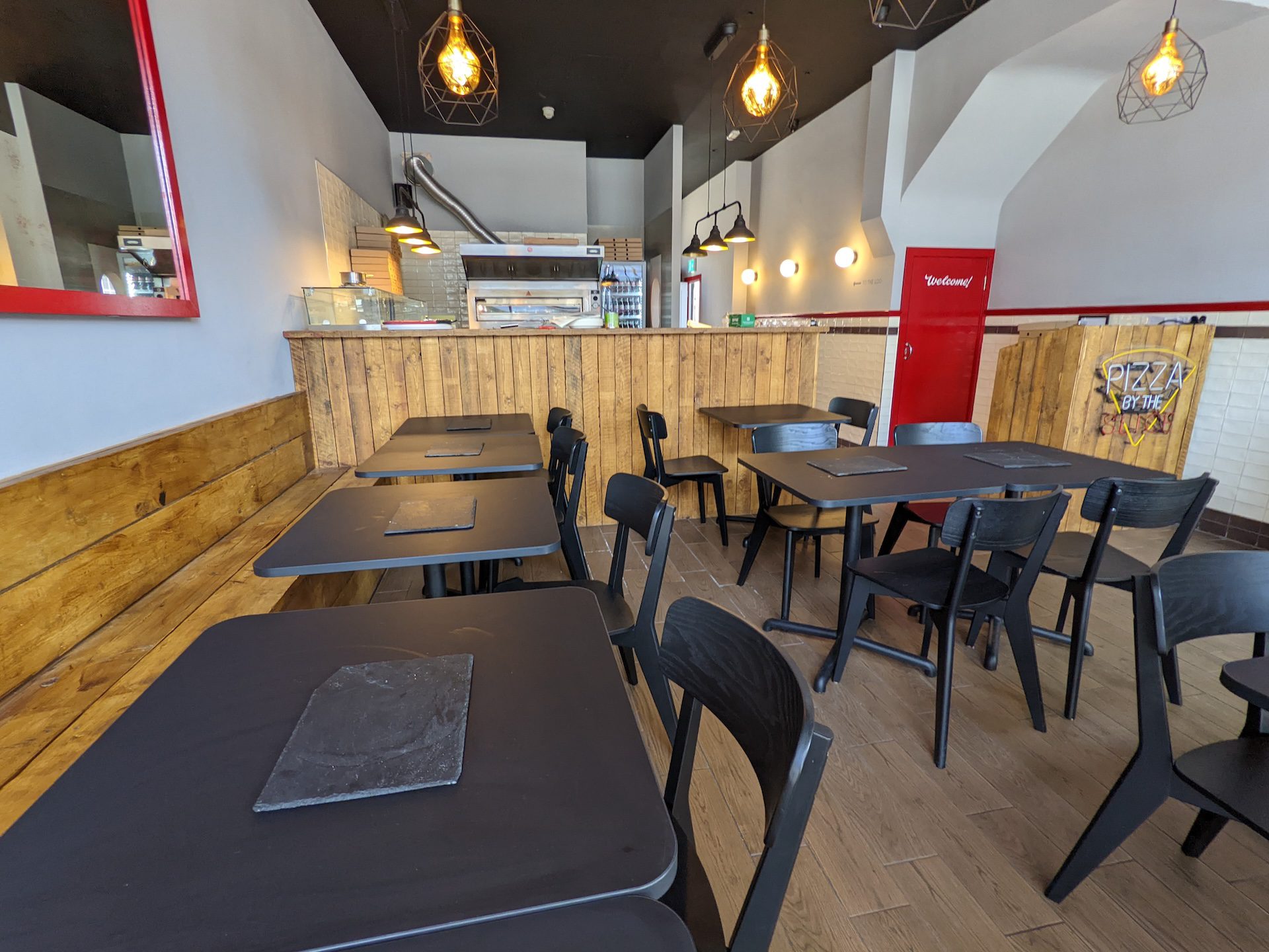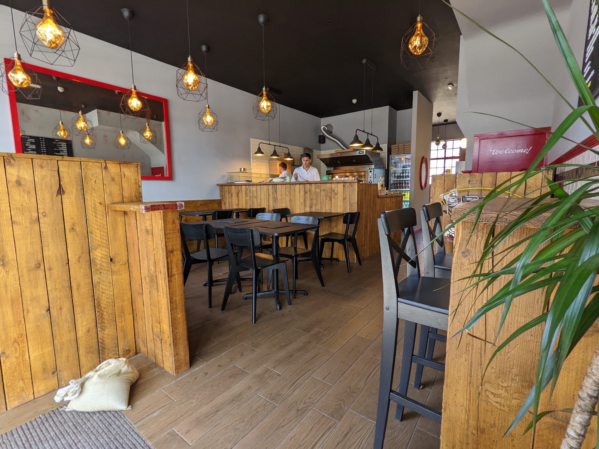 The counter and serving area were positioned to allow clear visibility of the pizza-making process, reinforcing transparency and adding energy to the space.
